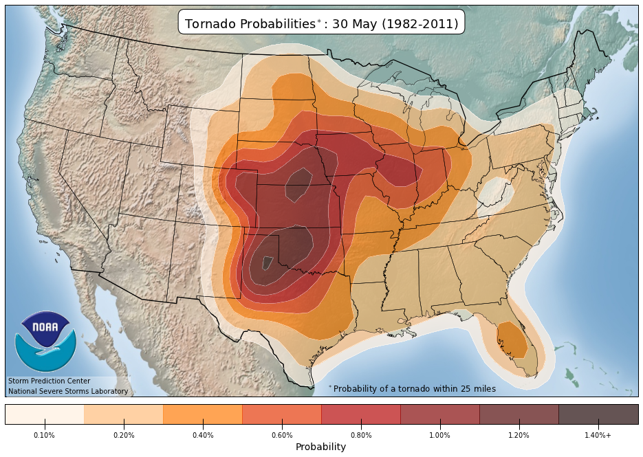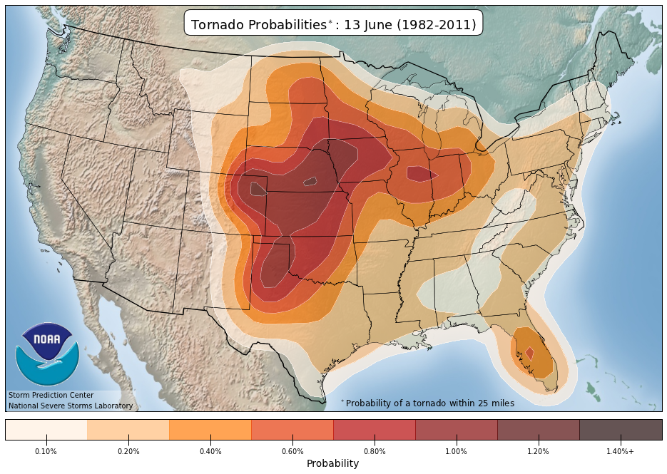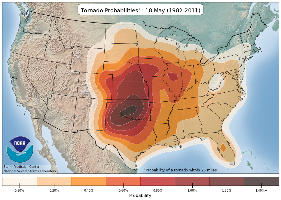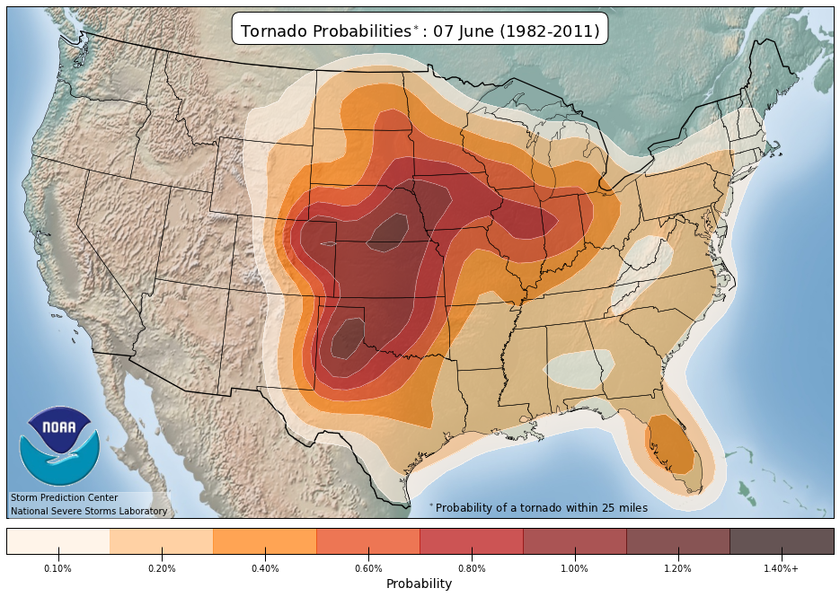 Tour dates are selected to coincide with the highest frequency of tornadoes in Tornado Alley. Below are mapped climatological breakdowns of tornado probabilities and placement from the SPC and NSSL on a per tour basis. Click on the images below for larger views.